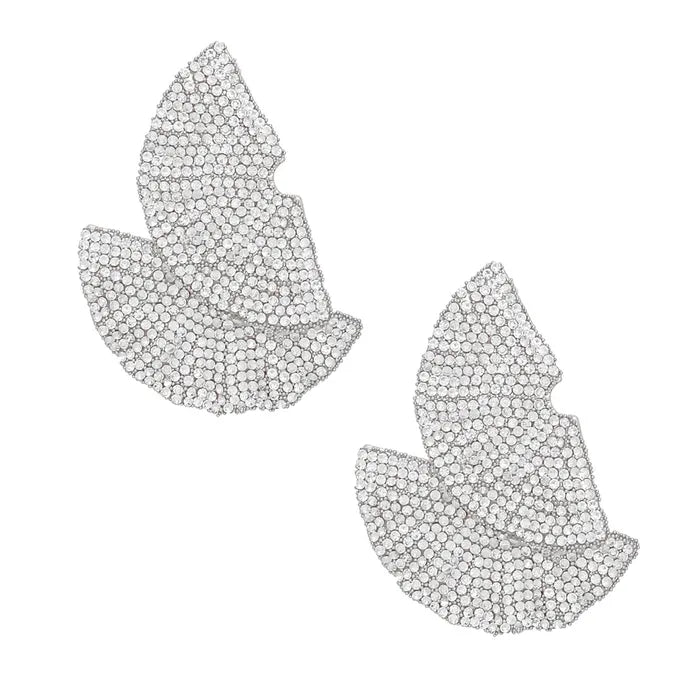 Women's Stud Earrings. Large Gatsby-Era 1920's Art Deco Glam Gold Metal Double Ruffled Offset Fan Earrings Encrusted with Clear Rhinestone Detailing. Post Backing. 2.75 x 2 inches