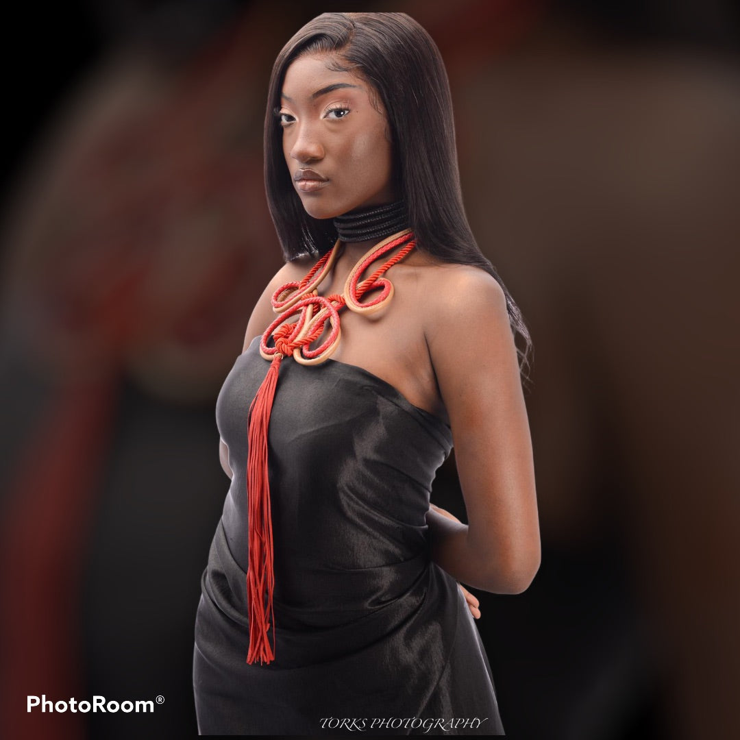 Red and Camel Faux Leather Rope and Cord Twisted Necklace Set with Suede Tassel Drop. Tassel measures 14.5 inches long. Weighs .20 lbs.
