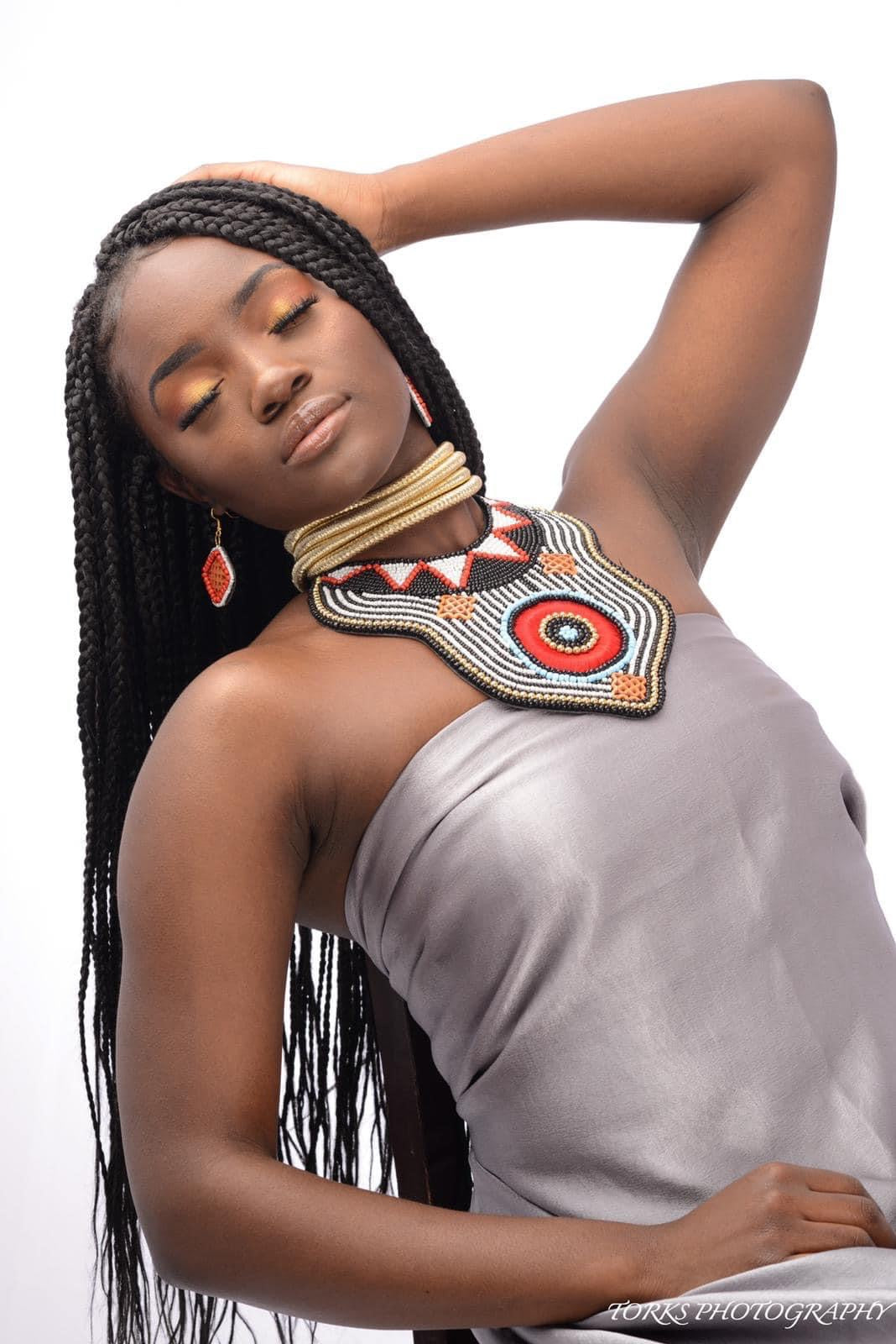 Black and White Emrboidered Bead with Red Thread Center Design and Gold Bead Edging Tribal Bib Style Necklace Set. Black Faux Leather Backing and Adjustable Ribbon Tie. Matching Earrings. Measures 7.5 inches wide and 6.5 inches long. Weighs .35 lbs
