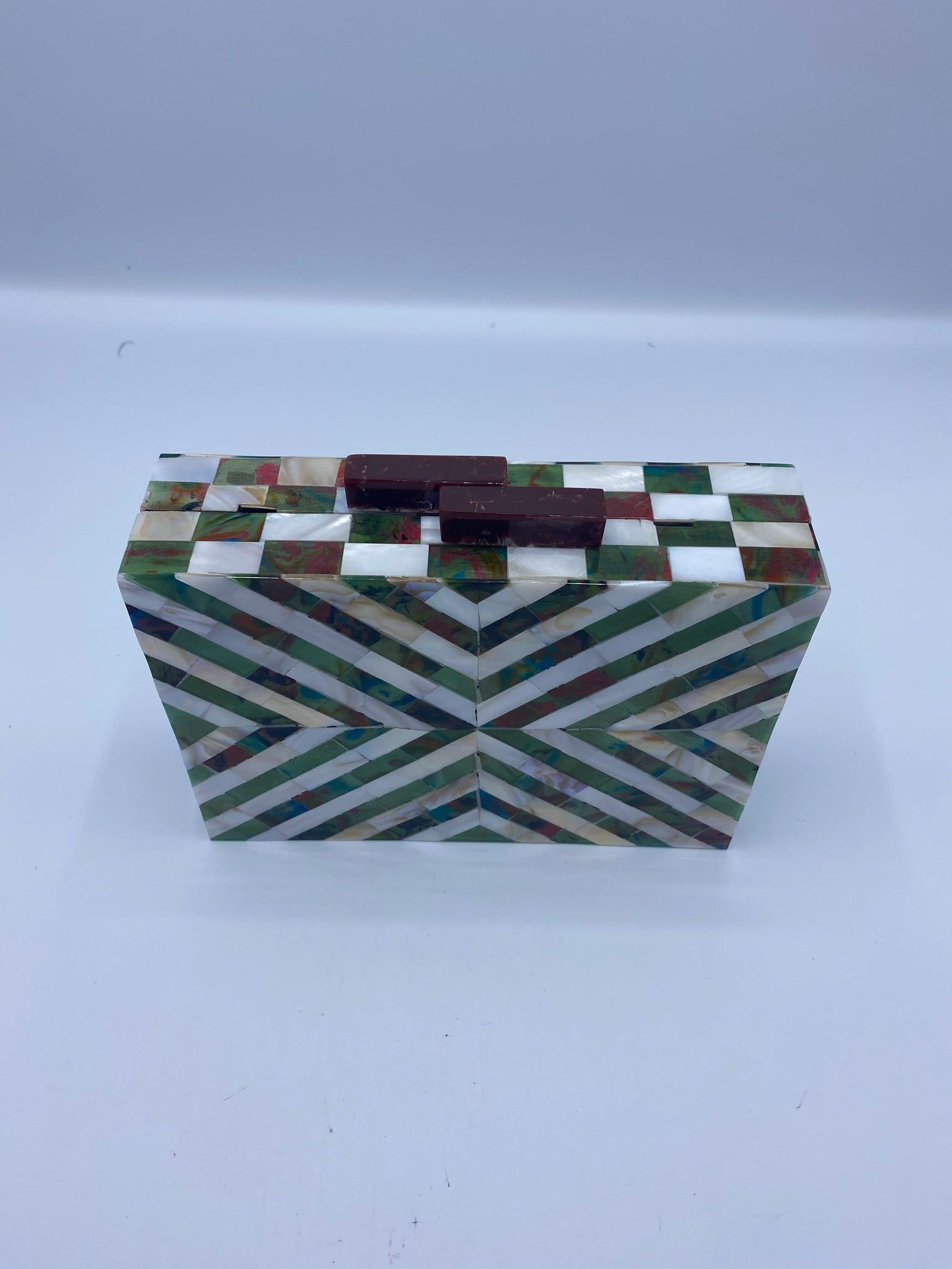 Handcrafted Chevron Green and White Mother Of Pearl With Wooden Base Clutch with Attached Gold Shoulder Chain.