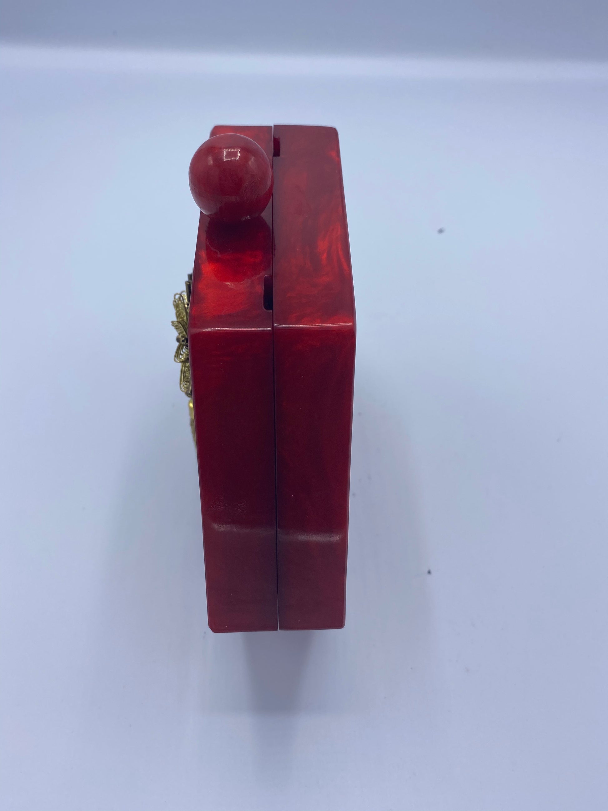 Handcrafted Red Hexagon Resin with embellishment of pearls and stones Clutch Attached Gold shouChain included.