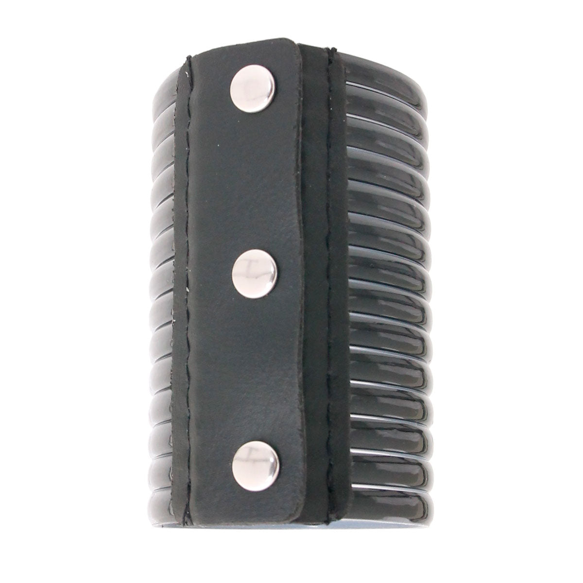 Shiny Vegan Leather Ribbed Cuff Bracelet Featuring Adjustable Snap Closure. Cuff Measures 4 inche wide and 10.65 when laid flat. 10.65 inches